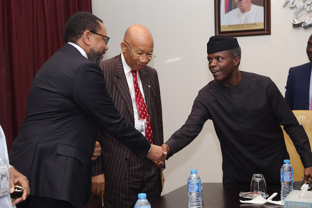 An MTN Team led by the Nigerian chairman, Pascal Dozie visited Acting President Yemi Osinbajo on Thursday in Abuja. MTN Group chairman, South Africa’s Mr. Phutuma Nhleko was also in the entourage along, with senior lawyer, Gbenga Oyebode, Chief Victor Odili, Colonel Sani Bello and the CEO of MTN Nigeria, Ferdinand Moolman.