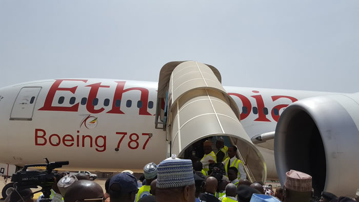 The minister of state for Aviation, Senator Hadi Sirika, received the first international flight made by Ethiopian Airlines (Boeing 787) at the Kaduna International Airport, on Wednesday.