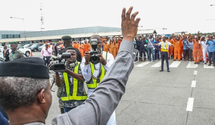 Vice President Yemi Osinbajo waves to the staff of NLNG during his visit to the plant. 12th October 2017.