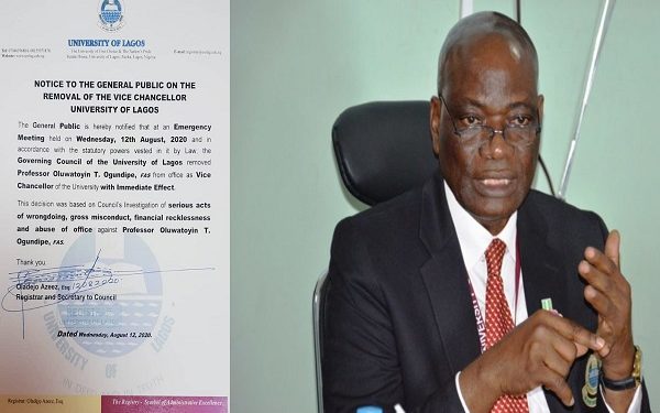 A statement by the Registrar and Secretary to Council, Mr. Oladejo Azeez titled: Notice to the General Public on the removal of the Vice-Chancellor of the University of Lagos” based the decision on gross misconduct, financial recklessness among others.