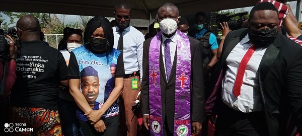 The remains of late spokesman of Afenifere, Yinka Odumakin have arrived for final Lying- in- State at Origbo Anglican Grammar School Moro, Osun State The widow, Dr Joe Okei Odumakin, led undertakers carrying the corpse to the venue
